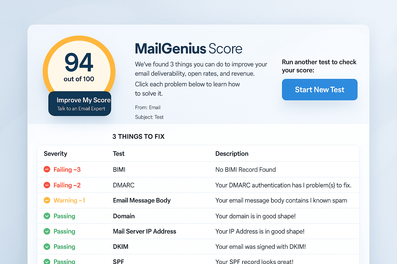 MailGenius tests your inbox placement in real-time, monitors your domain’s health (SPF, DKIM, DMARC), and alerts you to problems like blacklists or spam triggers. You’ll always know if your emails are reaching your audience.